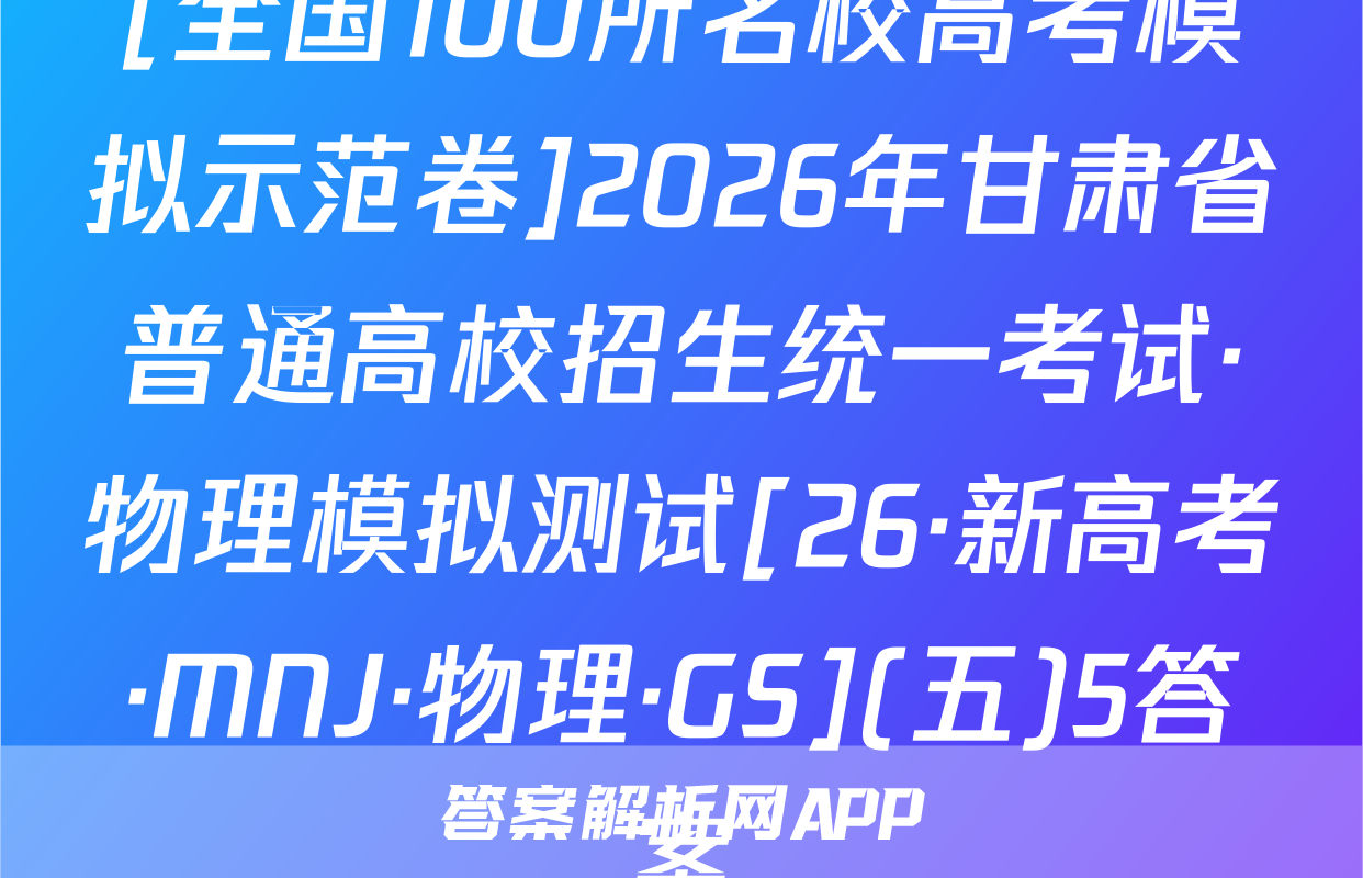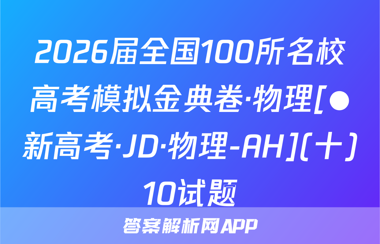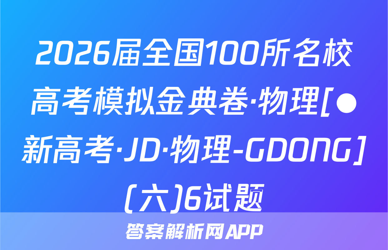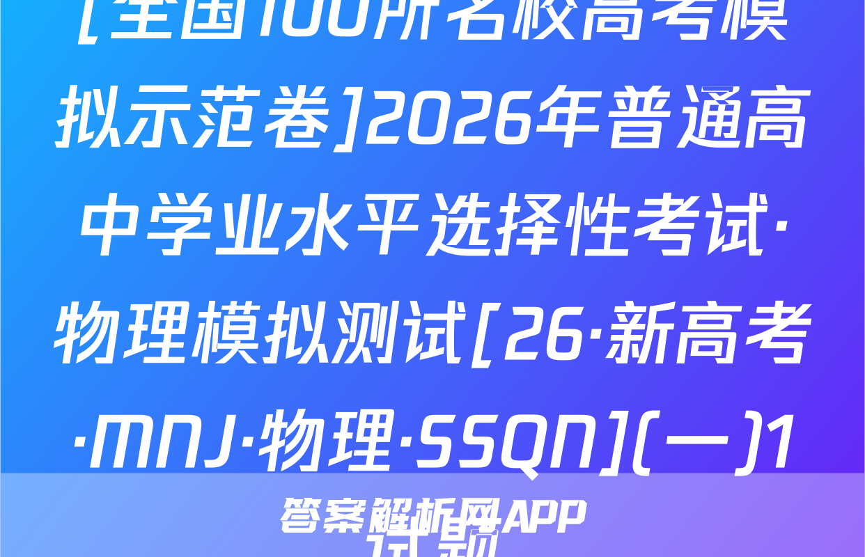 02s按秘密级事项管理★启用前全国100所名校高考模拟示范卷写出文字小是求日2026年普通高中学业水平选择性考试C.0.30s时,木棒的加速度为正向最大值全国100所名校高考模拟示范卷公集物理模拟测试(一)D.木棒在0,30s时与0.608时受到的合力相同心,6本试卷共100分考试时间75分钟3.2025年月。日在北京天安门大调天上我国展示了东风-5C液体际数路技导弹,如图所不若从地面上A点发对妆导,导弹沿ACDB精圆机范飞行·及注意事项:1.答题前,考生务必将自己的姓名、准考证号填写在答题卡上。终击中地面目标B。巴知CD段为导弹在大气发外关固发动机后直由飞行的一段2回答选择题时,选出每小题答案后,用铅笔把答题卡上对应题目的答案标号涂黑。轨选D点距地面的产停地球半色的。地球表面的玉力加注度为8:下列锁法正确的是如需改动,用橡皮擦干净后,再选涂其他答案标号。回答非选择题时,将答案写在答暖上。写在本试卷上无效。A.导弹沿CD段飞行时处于失重状态,不受地球引力作用B.导弹在C点的加速度大于其在D点的加速度大气3.考试结束后,将本试卷和答题卡一并交回。人C.导弹在A点的发射速度大于第二字寅速度地球-、单项选择题:本题共7小题,每小题4分,共28分。在每小题列出的四个选项中,D.导弹在D点的加速度大小为。只有一项符合题目要求。1.2025西安马拉松,10月19日在永宁门开赛。已知赛道全长42.195km。若在-段4.静电透镜被广泛应用于电子器件中,某阴极射线示波管的聚焦电场如图所示,其中平首路西上的过程中,某运动员在8内速度从6提升到2如,虚线为等差等势线,任意两条相邻等势线间的电势差相等,00为该电场的中心轴线。电场中,实线ae与O0'平行,且a,b,c、d、e为实线ae和虚线的五个交点,其中则下列说法正确的是a,bc三点的电势关系为p>p6>p。现一电子从a点以速度u,沿直线abc方向A该运动月跑完该次马拉松的位移大小为42.19饭km3米射人电场,电子仅受静电力的作用,则下列说法B研究该运动员在比赛中的跑步姿势时,可以起他看成质点州网8.3强正的是C这段时间内,该运动员的平均加速度大小约为0.06m/s2州Aa点处的电场方向沿实线ae由a指向D.跑步过程中,该运动员的重心始终在其灯何中心处NB.b点处的电场强度与e点处的电场强度相同2一根粗细均匀的木棒下端绕几圈铁丝,木棒就可以竖直浮在杯内水中,如图甲所示。现20C.电子可能沿直线在a、e间做往复运动线将木棒轻轻向下压一小段距离后由静止释放,此后木棒在竖直方向的运丸可视为简谐运D.电子在电场中做加速度变化的曲线运动动。从释放时开始计时,得到木棒的振动图像如图乙所示,则下列说法正磅的是5,为提高电动自行车的安全性能,最新的(电动自行车安全技术规范》规定,电动自行车最高设计车速不超过25km/h。假设某人驾驶如图所示的电动自行车由静止开始做匀加速直线运动,经过25s速度达到5m/s,电机恰好达到额定功0.300.450.600.75率。已知人(包括头盔)、车的总质量为100kg,行驶过程中一中米件尽A.木棒的振幅为8cm,周期为入6g0,0比限受到的阻力恒为人、车总重力的5,重力加速度g取10m/S测B在0~0,15s内,木棒的动能逐海变小A匀加速运动过程中,电动自行车的加速度大小为0.5m/s物理卷一人第1共8页伤·新海幸,N·物理58Q物理卷(一)第2页(共8(26·新高考,MNW·物理·SSQN)