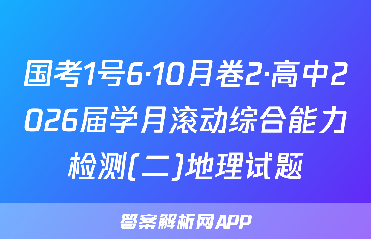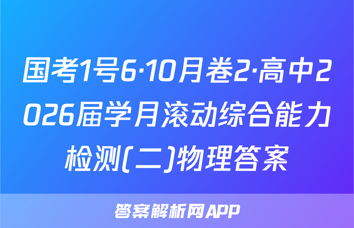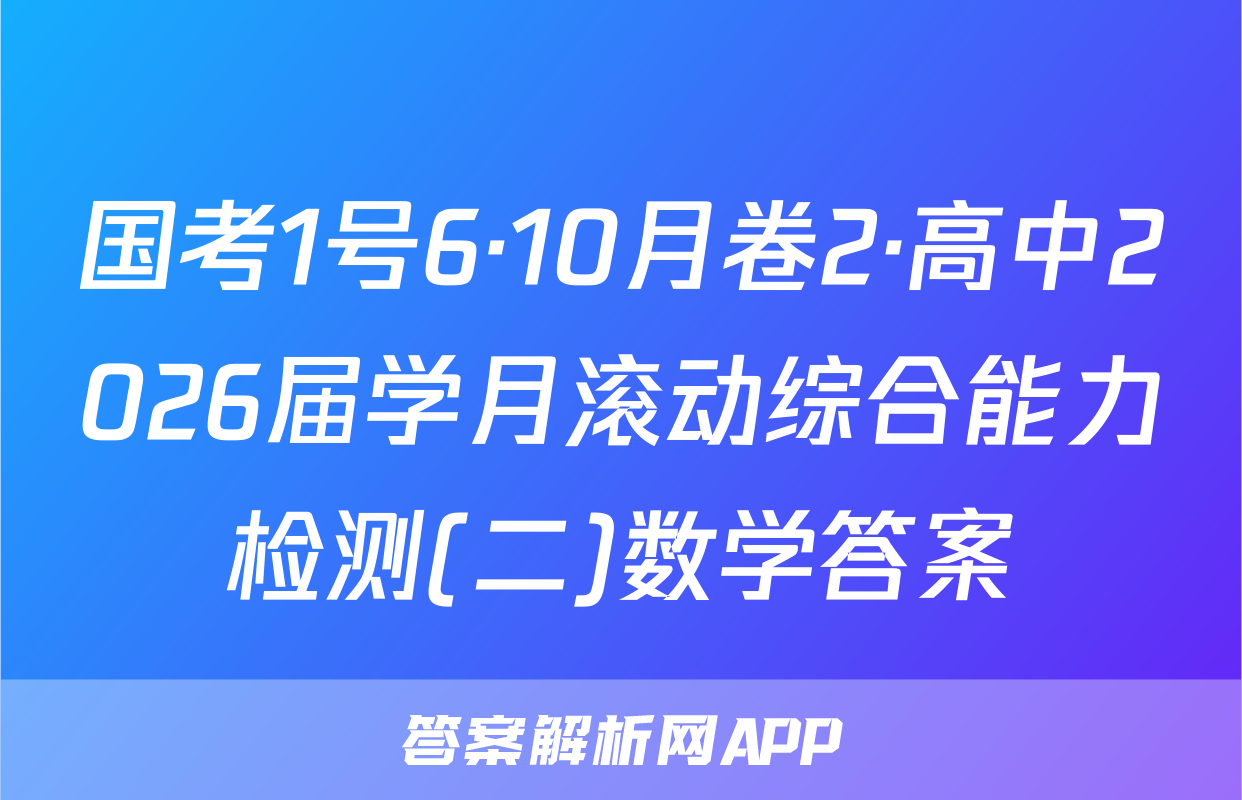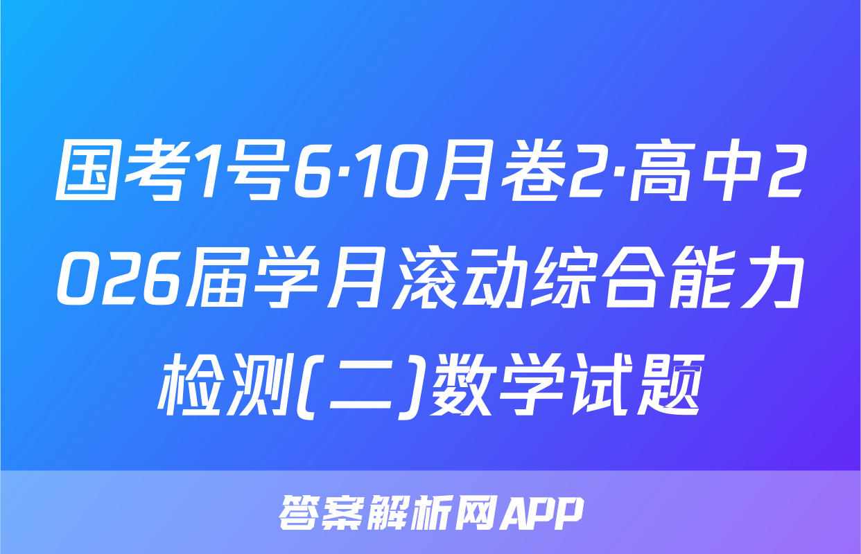 国考0号■06班级姓名高中2026届学月滚动综合能力检测(二)数学本试卷分选择题和非选择题两部分。满分150分,考试时间120分钟。注意事项:答案解析网1.答题前,务必将自己的班级、学校、姓名、考场号、座位号和准考证号填写在答题卡规定的位置上答案解析网2.答选择题时,必须使用2B铅笔将答题卡上对应题目的答案标号涂黑。如需改动,用橡皮擦干净后,再选涂其他答案标号答案解析网3.答非选择题时,必须使用0.5毫米黑色签字笔,将答案书写在答题卡规定的位置上。4.所有题目必须在答题卡上作答,在试题卷上答题无效。答案解析网5.考试结束后,只将答题卡交回答案解析网一、选择题:本题共8小题,每小题5分,共40分.在每小题给出的四个选项中,只有一项是符合题目要求的.答案解析网1.不等式十2≥3的解集为答案解析网A(-0,-]B.(-2-]c[-2,-D.(-0∞,2u[-+∞2.设集合A={一1,0,1,2,3},则满足{一1,0}三B二A的集合B共有答案解析网A.3个B.4个C.7个D.8个3.三个数a=0.31,b=0.2.1,c=0.2.2的大小顺序为答案解析网A.a>b>cB.b>a>cC.a>c>bD.b>c>a4.设a,B是锐角,则“a+B是钝角”是“tan atan B.>1”的答案解析网A.充分不必要条件B.必要不充分条件答案解析网C.充分必要条件D.既不充分也不必要条件5.正实数a,6满是a十6=1,则,41十6有A.最小值4一2√2B.最大值4一2√2答案解析网C.最小值2-2√2D.最大值2一2√2答案解析网国考1号6·10月卷2·数学第1页(共4页)