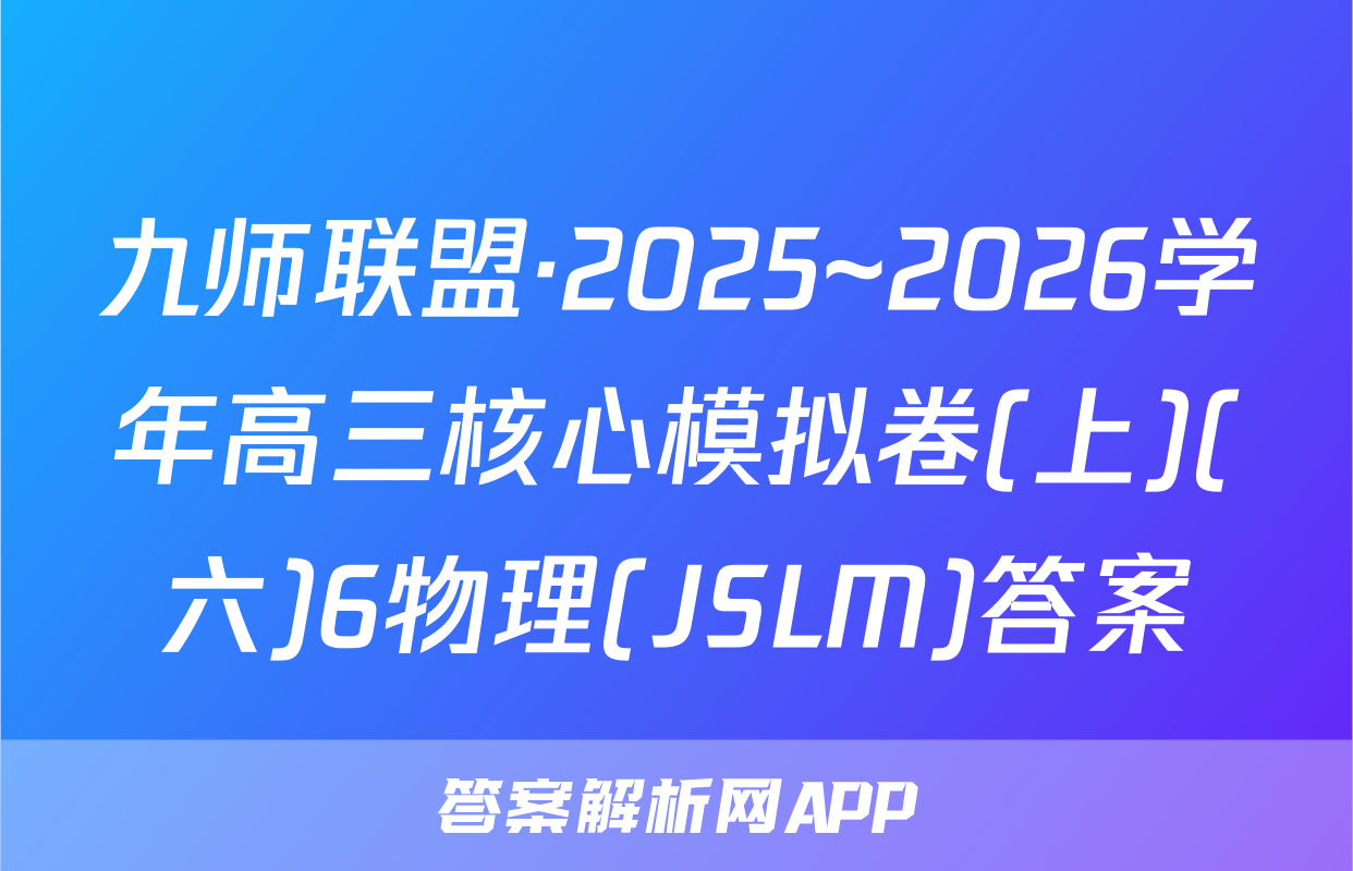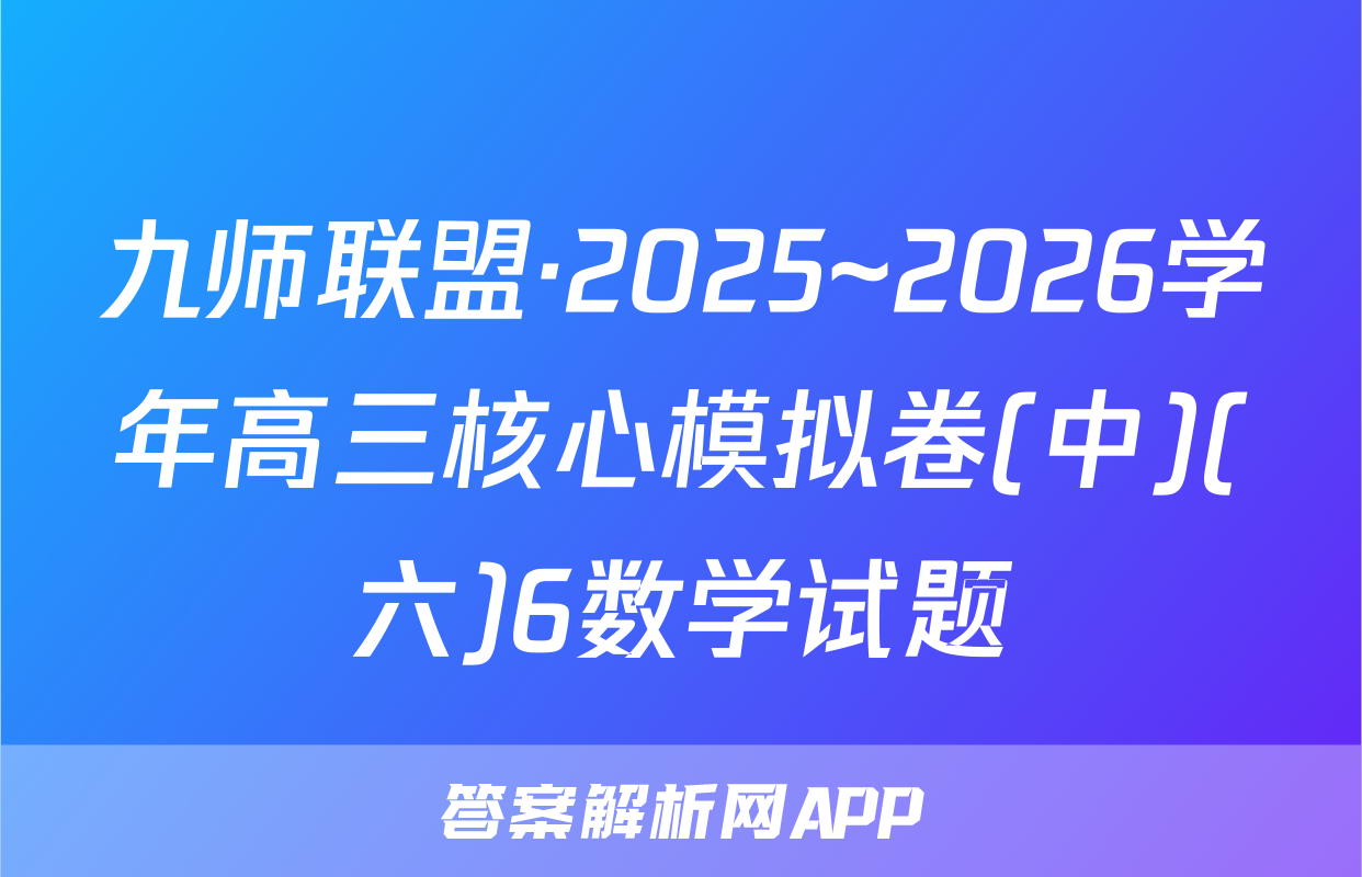2025~2026学年高三核心模拟卷(中)数学(六)注意事项:1本卷满分150分,考试时间120分钟。答题前,先将自已的姓名、准考证号填写在试题卷剂卡上,并将准考证号条形码粘贴在答题卡上的指定位置。2,选择题的作答:每小题选出答案后,用2B铅笔把答题卡上对应题日的答案标号涂只。写在卷、草稿纸和答题卡上的非答题区域均无效。3.非选择题的作答:用签字笔直接答在答题卡上对应的答题区城内。写在试题卷、草稿纸和答、上的非答题区域均无效。4.考试结束后,请将本试题卷和答题卡一并上交。一、选择题:本题共8小题,每小题5分,共40分。在每小题给出的四个选项中,只有一项是符合题求的。如:1,设全集U=(∈Nx≤6),集合A={1,2,3,4,B=(2,3,4,5},则Cu(AUB)=BA.{6}B0,6}:C.{1,5,6}D.{0,1,5,6}()酒2.设a,bCR,1是虚数单位,则(a十1)=0是“复数a+生为纯虚数”的乃出单的指6片米(A.充分不必要条件B.必要不充分条件C.充要条件、P由面的)次D.既不充分也不必要条件3.已知向量a,b的夹角为5,a=2,aL(a-b),则|2a+b=A02b=0.4a+Yub+b吃A43B.5√34-2X32=0C.486+6r6D.7554OB296+624.已知等差数列{an}的前n项和为Sn,S8=2,S16=6,则S2=6t6B.20C.22月.24A.183X32320+4965.已知底面半径为1,体积为严的圆维的顶点和底面圆周都在码硒球面上,则球0的表面积为B.16πe呀D.64元iGOON68p8ian(a-)是关于x的方程x2+mx-2=0的两个不同的根,且tana=2,则m=D.-42026.02.0916:11-2Q.43